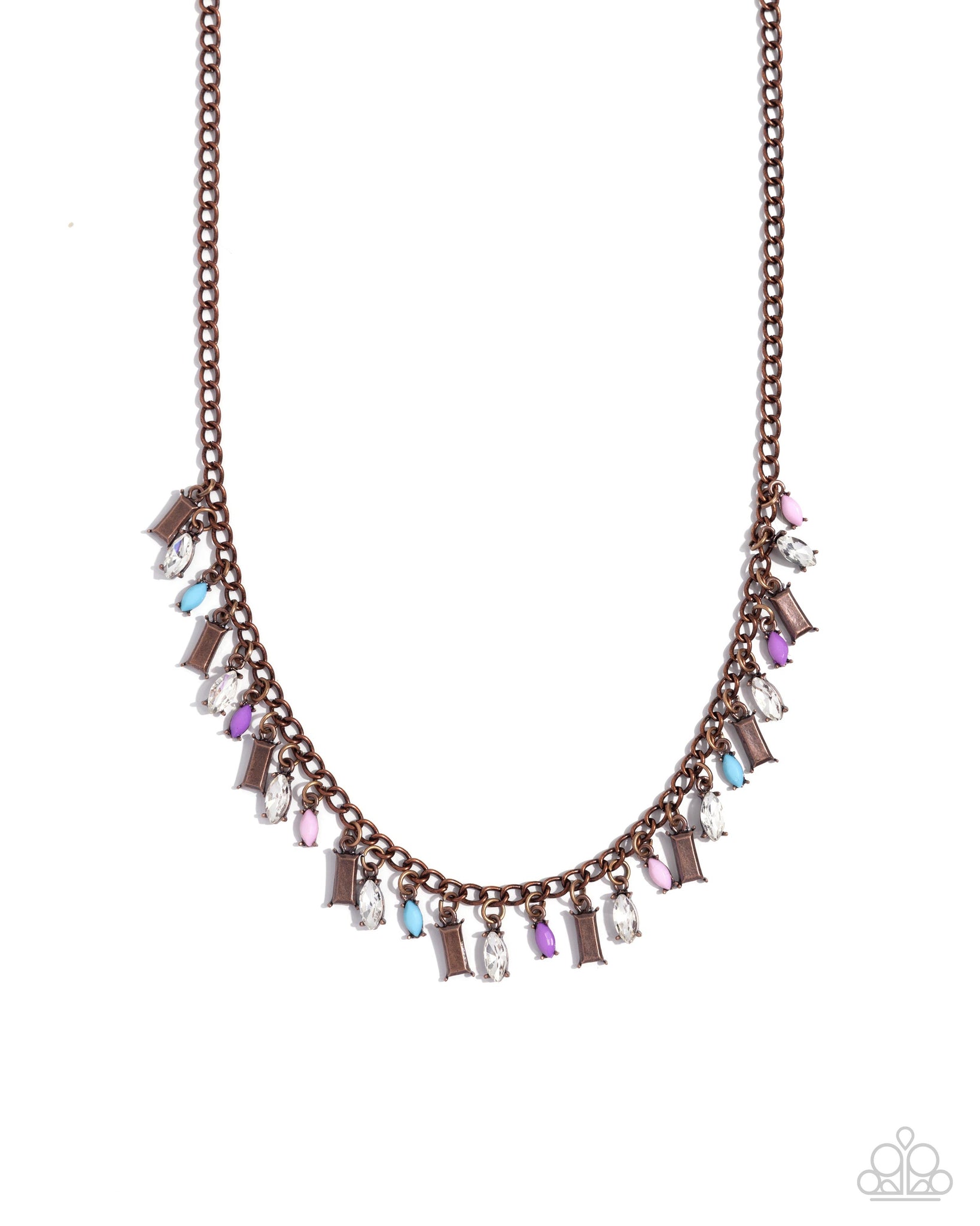 Tiffany, lavender, and light pink acrylic marquise-cut gems, white marquise-cut gems, and copper rectangles all in pronged copper fittings swing and sway along a classic copper chain below the neckline for a dramatic decadent display. Features an adjustable clasp closure.