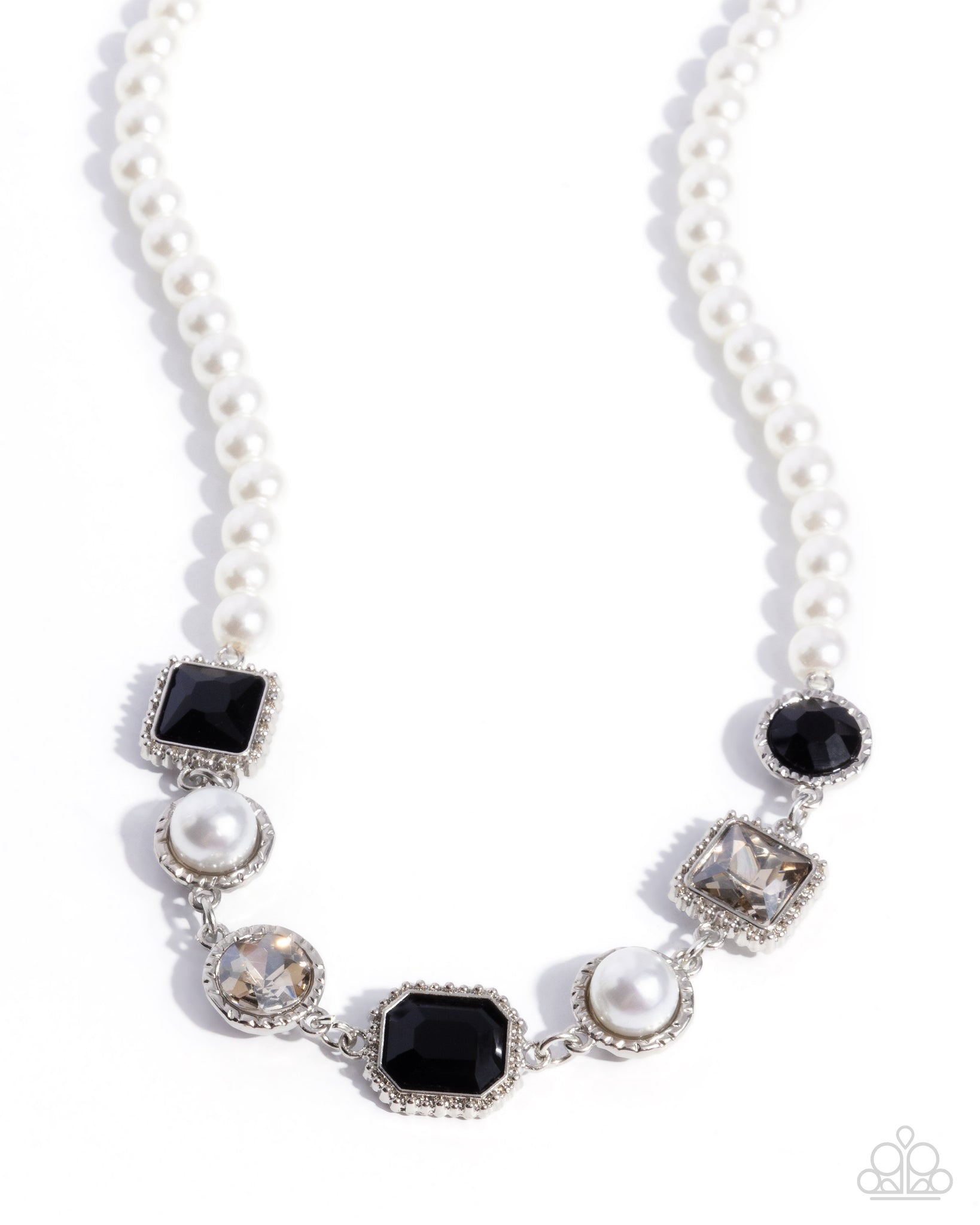 NECKLACE: Dazzling black and smoky rhinestones, in round, square, and emerald-cuts, fall along the collar in an alternating pattern beside glossy white pearls. Each glittery element is bordered by silver studs or hammered texture, giving way from a glossy strand of white pearls, further amplifying and maximizing its impact. Features an adjustable clasp closure.