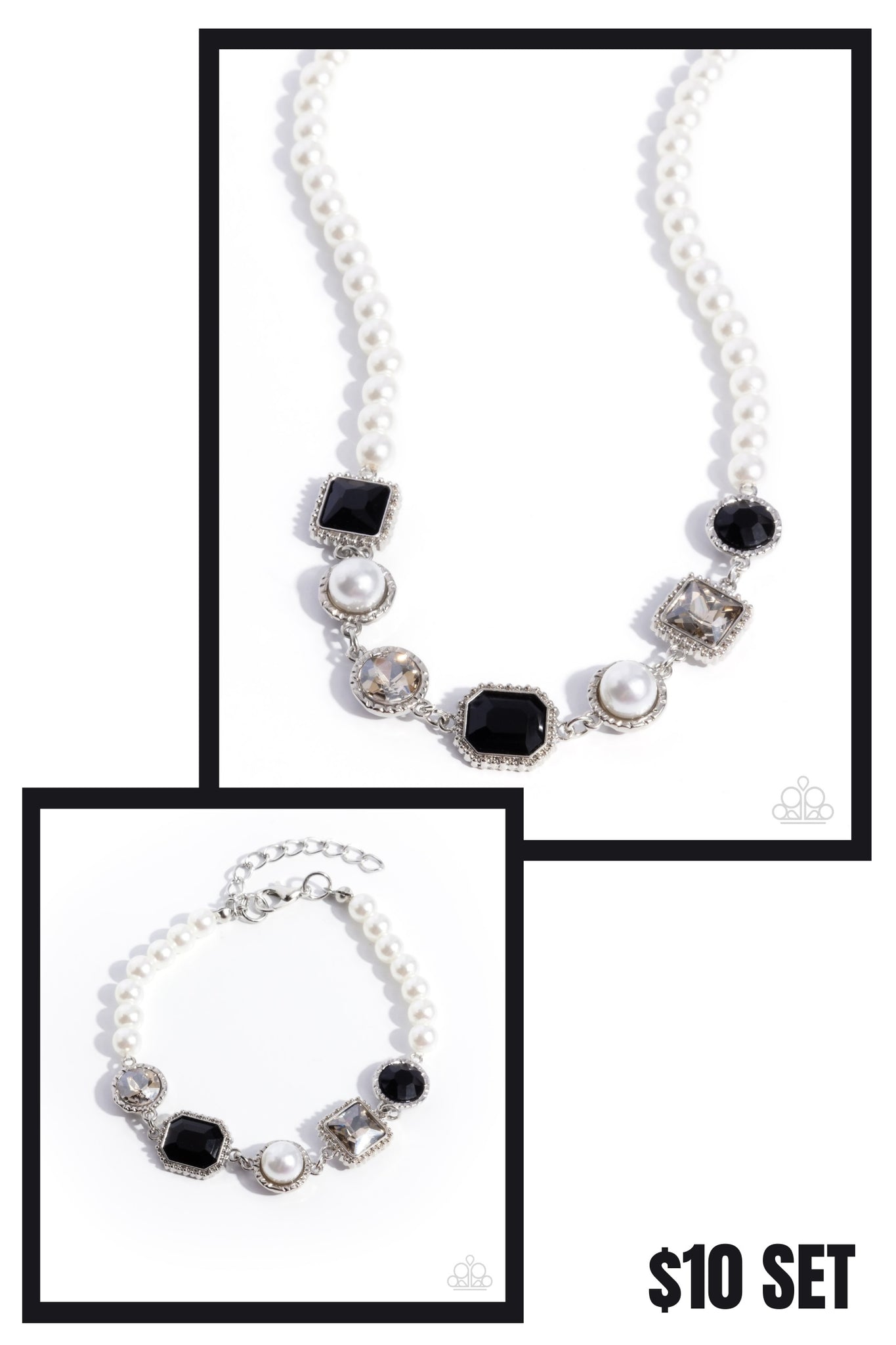 BRACELET: Dumbfounding Dazzle • Black P9RE-BKXX-402FU: Dazzling black and smoky rhinestones, in round, square, and emerald-cuts, fall along the wrist in an alternating pattern beside a glossy white pearl. Each glittery element is bordered by silver studs or hammered texture, giving way from a glossy strand of white pearls, further amplifying and maximizing its impact. Features an adjustable clasp closure.
