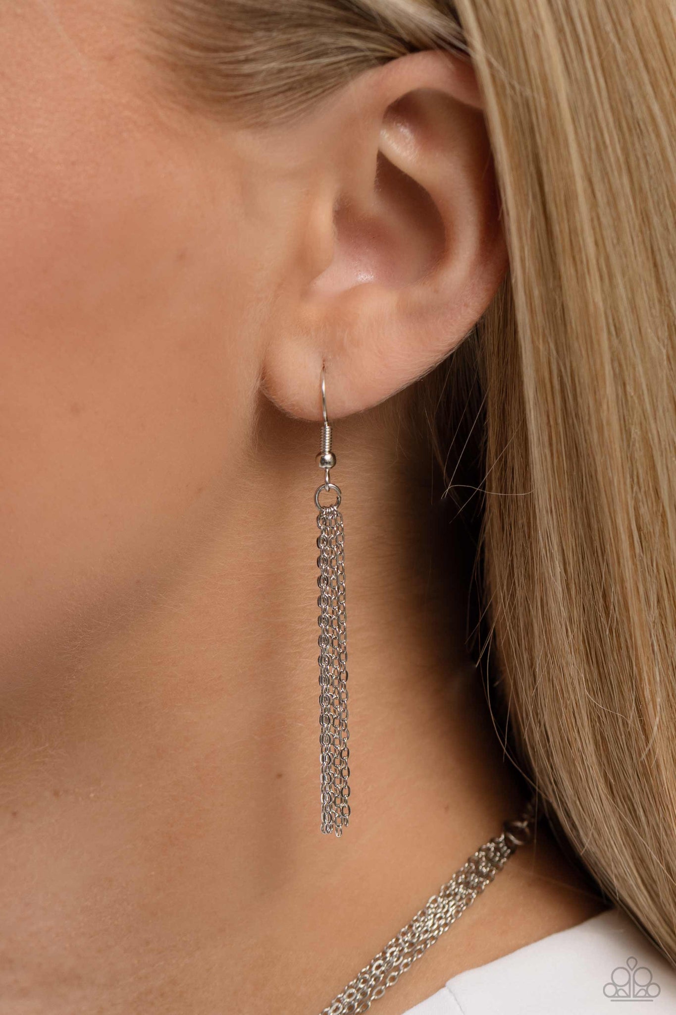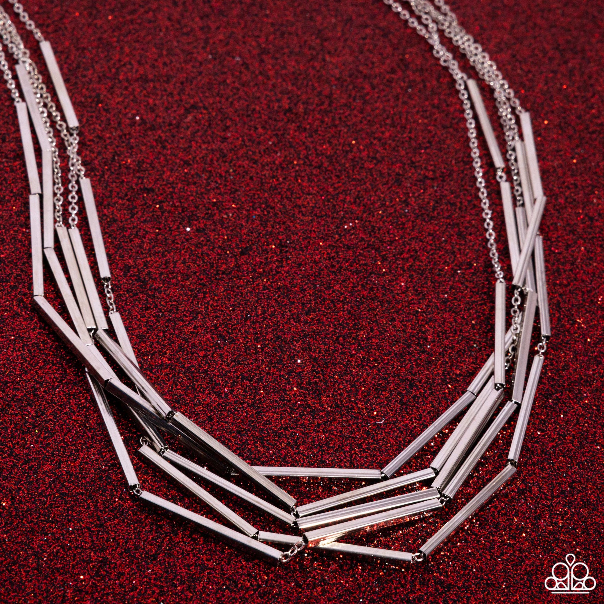 Featuring hollow cylindrical silver accents, five dainty strands of silver chains layer around the collar for an industrially assertive centerpiece. Features an adjustable clasp closure.