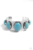 Set in elevated silver fittings, various oval turquoise stones wrap around the wrist atop a highly textured silver cuff for an earthy echo. As the stone elements in this piece are natural, some color variation is normal.