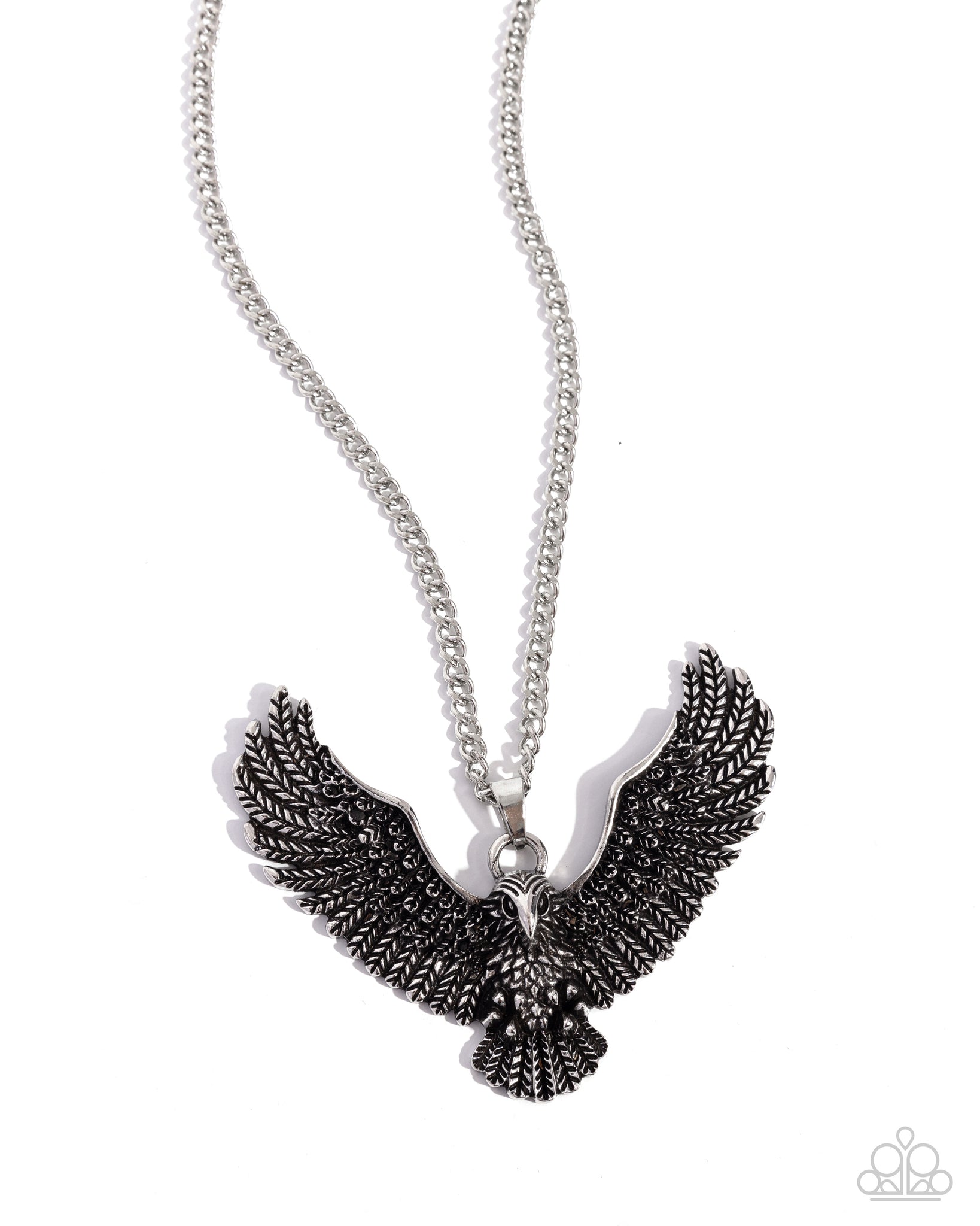 Gliding along a dainty silver curb chain, a highly intricate silver eagle pendant soars below the neckline for a free-spirited fashionable look. Features an adjustable clasp closure.