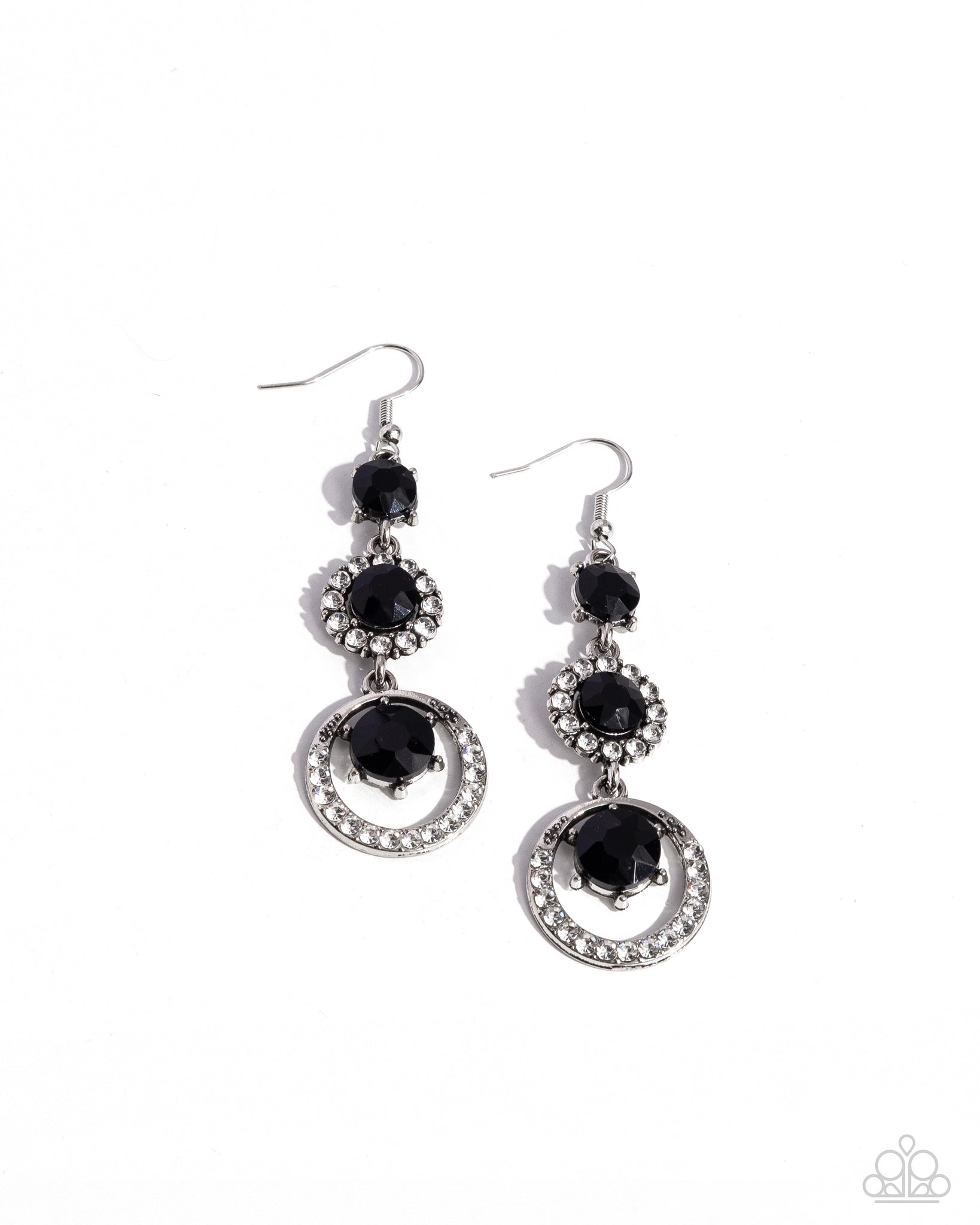A glamorous collection of brilliant, round, jet black gems drip down the ear, creating an irresistibly refined lure. The topmost gem features pronged fittings, followed by the center gem that is bordered by a halo of dainty white rhinestones for additional eye-catching shimmer. Encircling the lower-most gem, an airy, rhinestone-encrusted hoop completes the dazzling design. Earring attaches to a standard fishhook fitting.