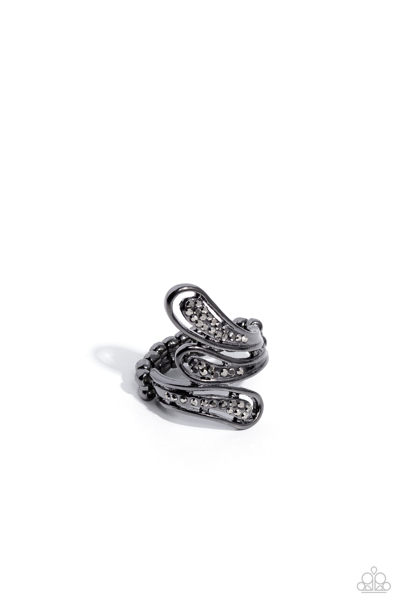 Featuring a paisley motif, three swooping frames of gunmetal, encrusted with dainty hematite rhinestones, curl up and below the finger for an edgy flare of fashion. Features a stretchy band for a flexible fit.