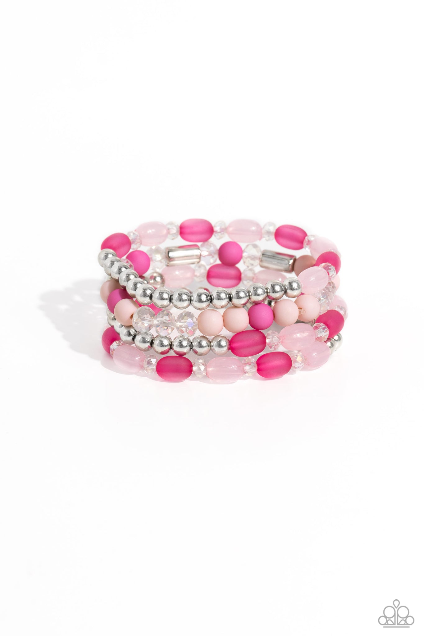 A shimmery collection of silver beads and accents, glassy long light pink and Pink Peacock beads, faceted clear beads, and various pink acrylic beads are threaded along stretchy bands around the wrist, creating glistening layers.