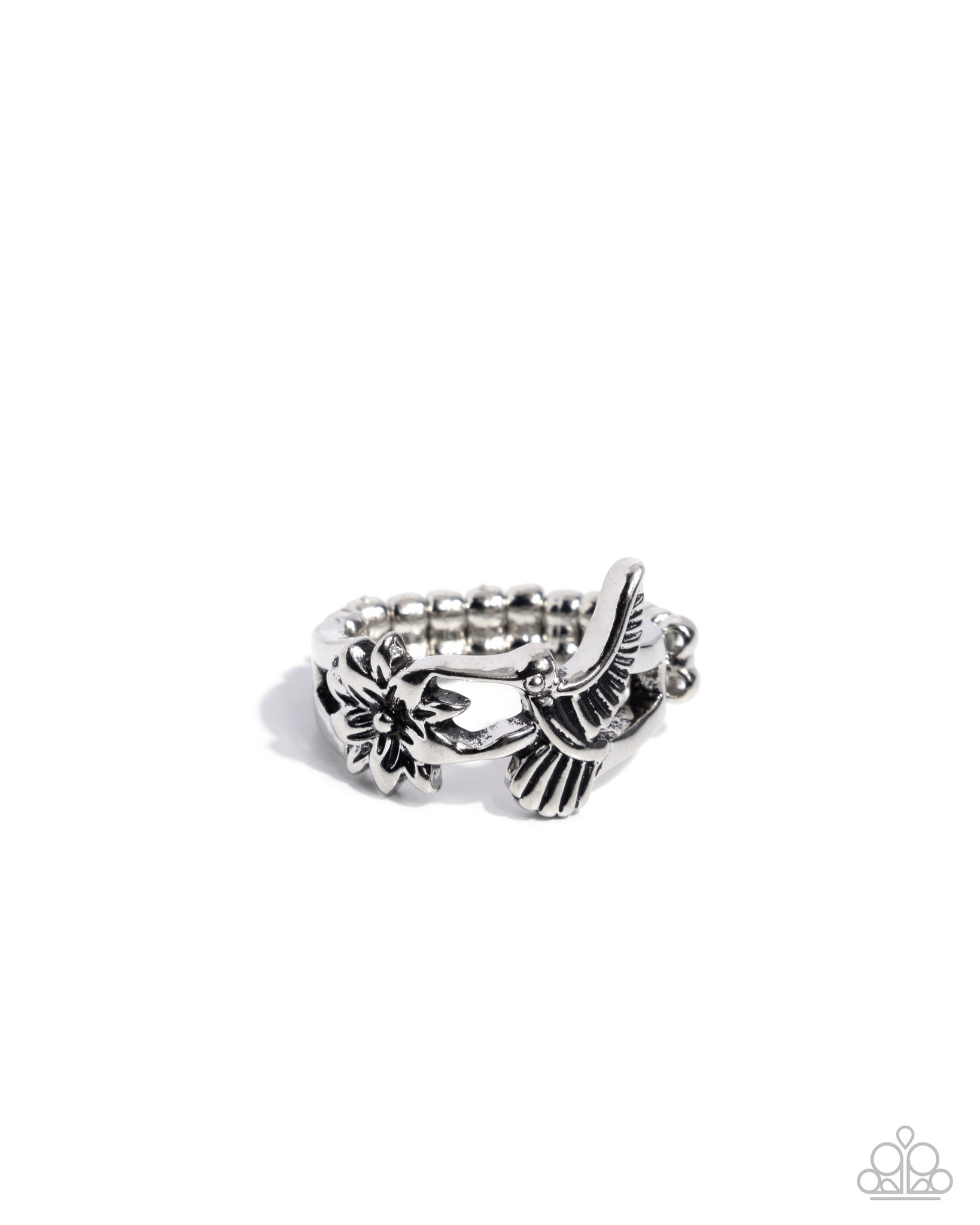 Fluttering beside a three-dimensional textured silver flower, a textured silver hummingbird stands out atop the finger for a wildly whimsical centerpiece. Features a dainty stretchy band for a flexible fit.