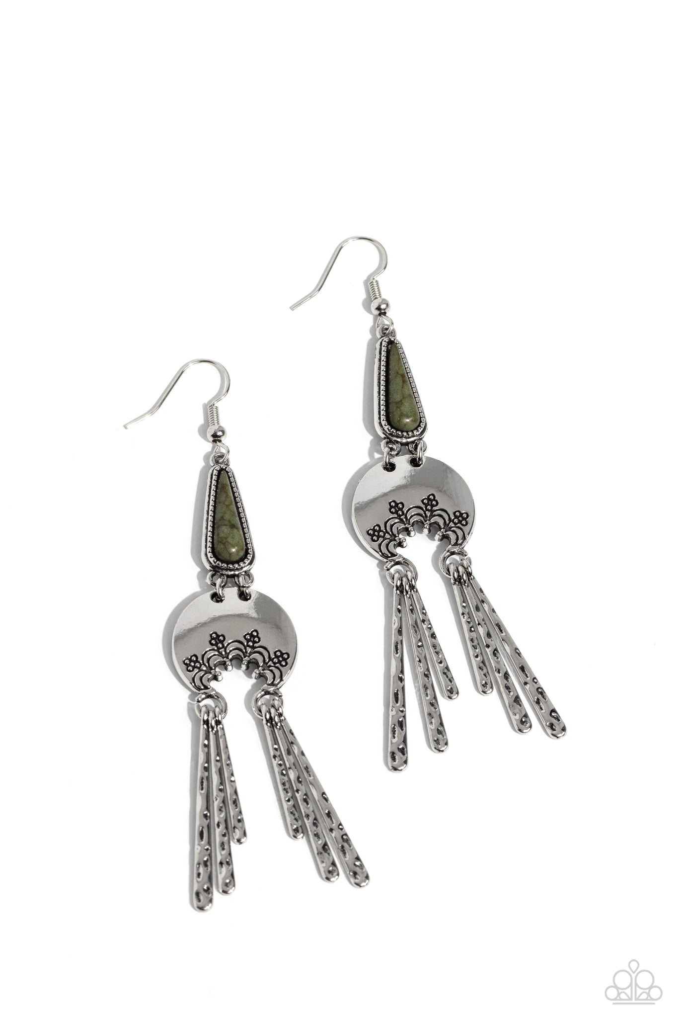 An olive stone pressed in a studded triangular fitting, and a silver floral-decorated half moon frame link into an earthy lure. A collection of daintily textured silver tassels in varying sizes swing from the bottom of the stacked frame for a whimsical finish. Earring attaches to a standard fishhook fitting. As the stone elements in this piece are natural, some color variation is normal.