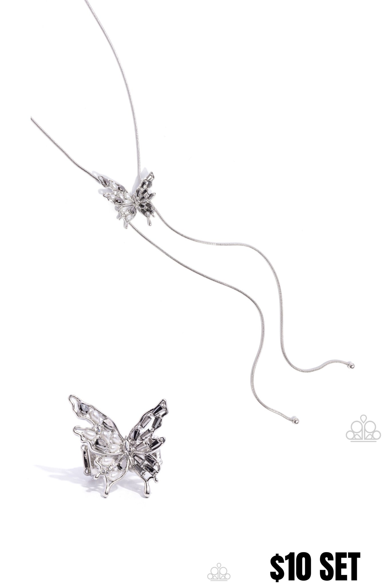 NECKLACE: Fluttering along a strand of glistening silver snake chain, an abstract silver butterfly sprinkled with a collection of dainty emerald-style hematite gems across one wing while teardrop hematite gems and teardrop white pearls create the other wing, glistens along the chest for a mystically mismatched adjustable pendant. Features a bolo closure.