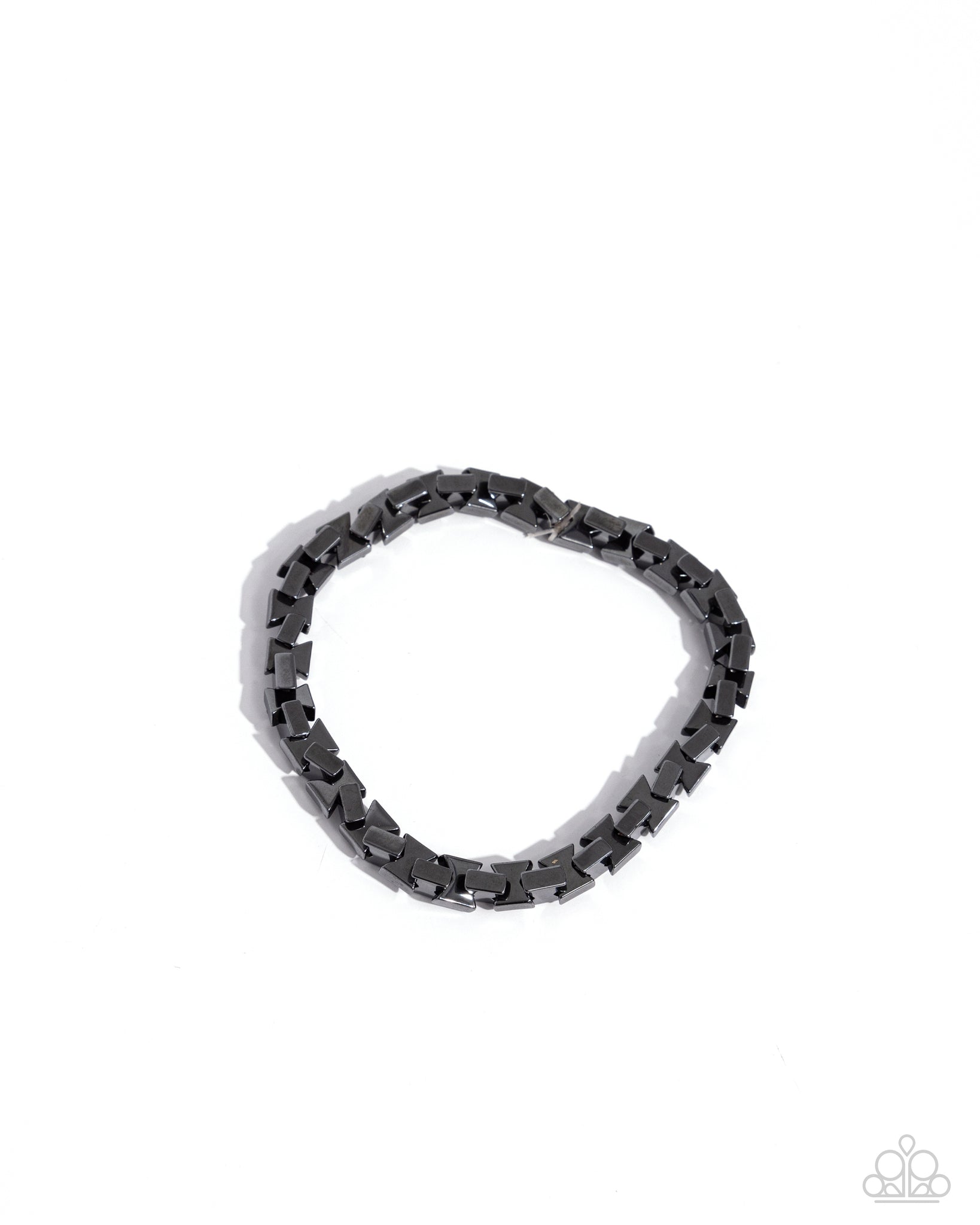 Bold, hourglass-like shaped gunmetal beads, featuring a radiant sheen, interlock and twist around the wrist for an industrial-inspired look.