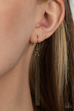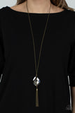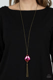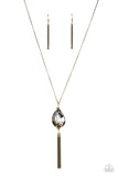 Infused with a glistening brass chain tassel, an oversized oil spill teardrop gem swings from the bottom of a lengthened brass chain for a glamorously glitzy finish. Features an adjustable clasp closure.