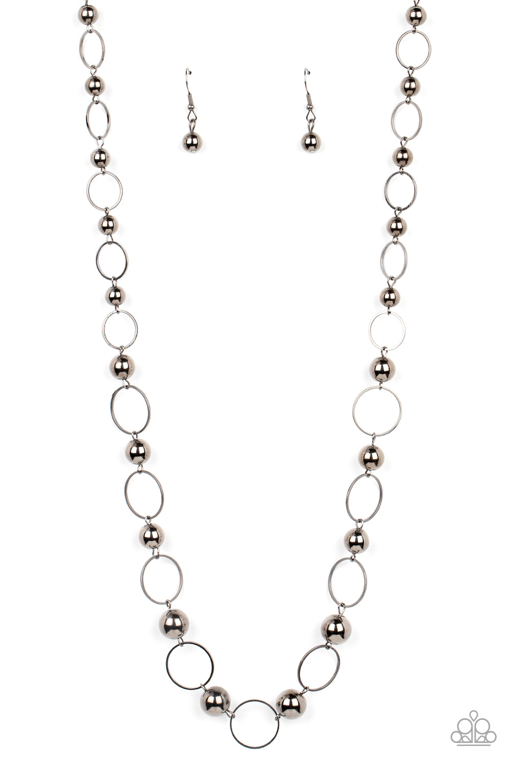 Gradually increasing in size, a glistening collection of gunmetal beads and gunmetal hoops alternate across the chest for a classic metallic fashion. Features an adjustable clasp closure.