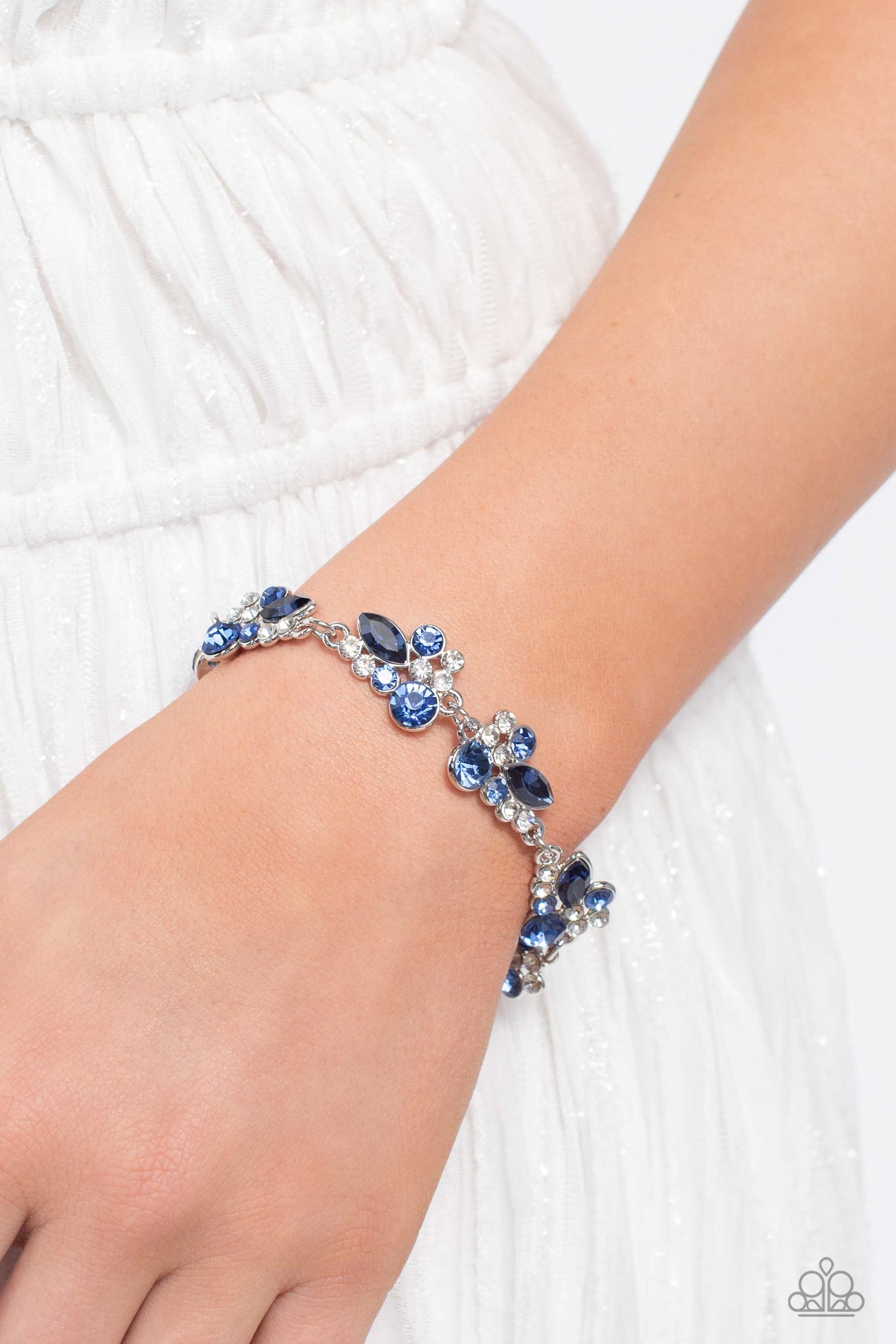 An eclectic collection of white and blue round rhinestones in varying sizes and marquise-cut gems in a blue shade cluster around the wrist in high-sheen silver frames. Patterned in an abstract manner, the clusters interlock together, emitting light from every faceted angle. Features an adjustable clasp closure.