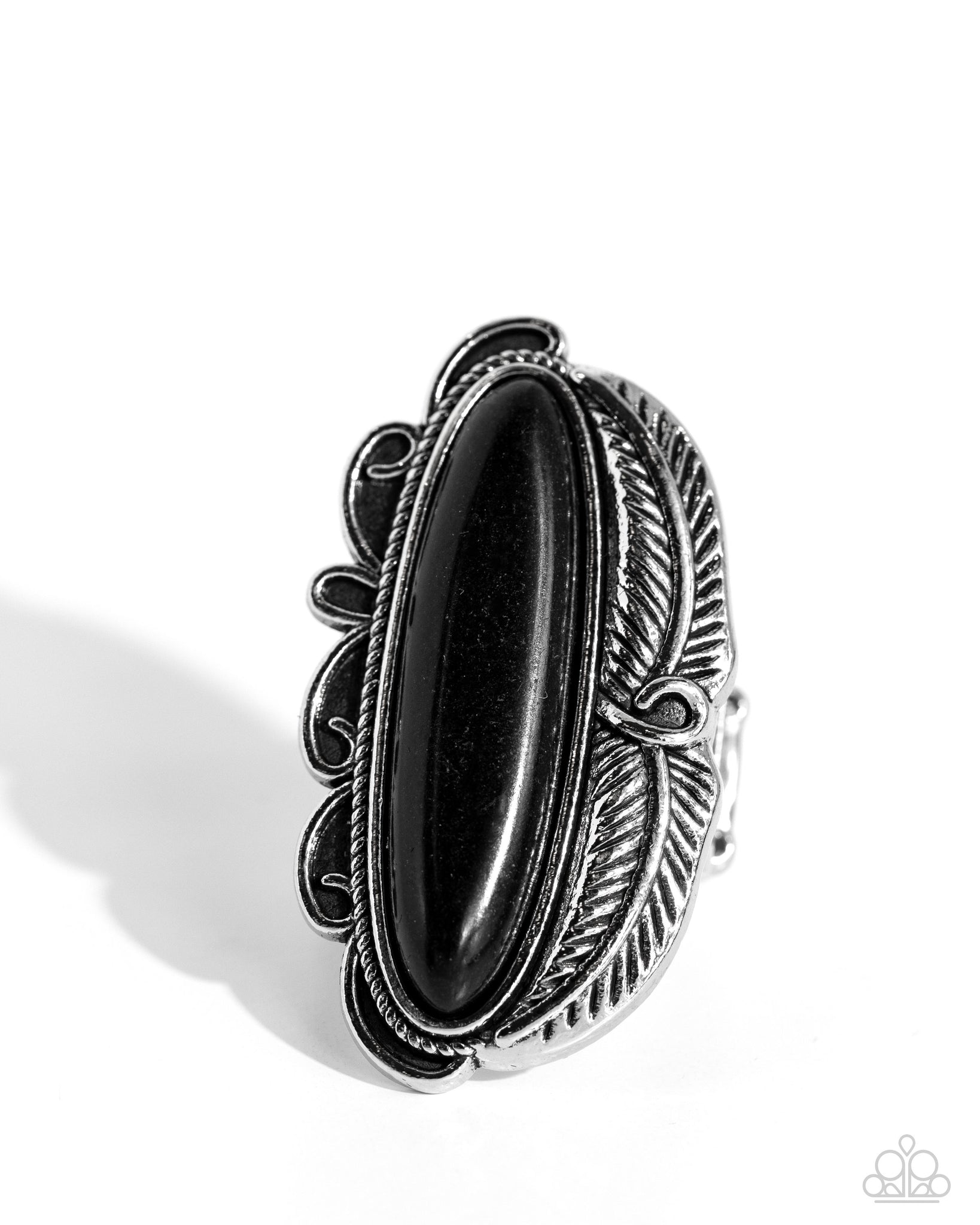 Leafy silver feathers and scalloped silver accents delicately envelops an oblong black stone atop a studded silver frame, resulting in a colorfully rustic centerpiece atop the finger. Features a stretchy band for a flexible fit.