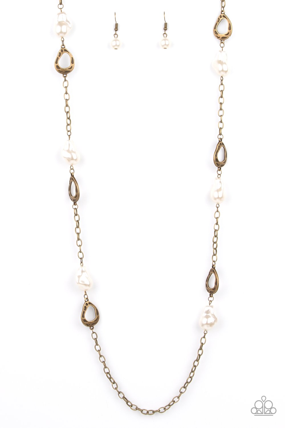 Asymmetrical hammered brass frames and imperfect pearly accents link with sections of antiqued brass chains across the chest, creating a rustic and refined statement piece. Features an adjustable clasp closure.