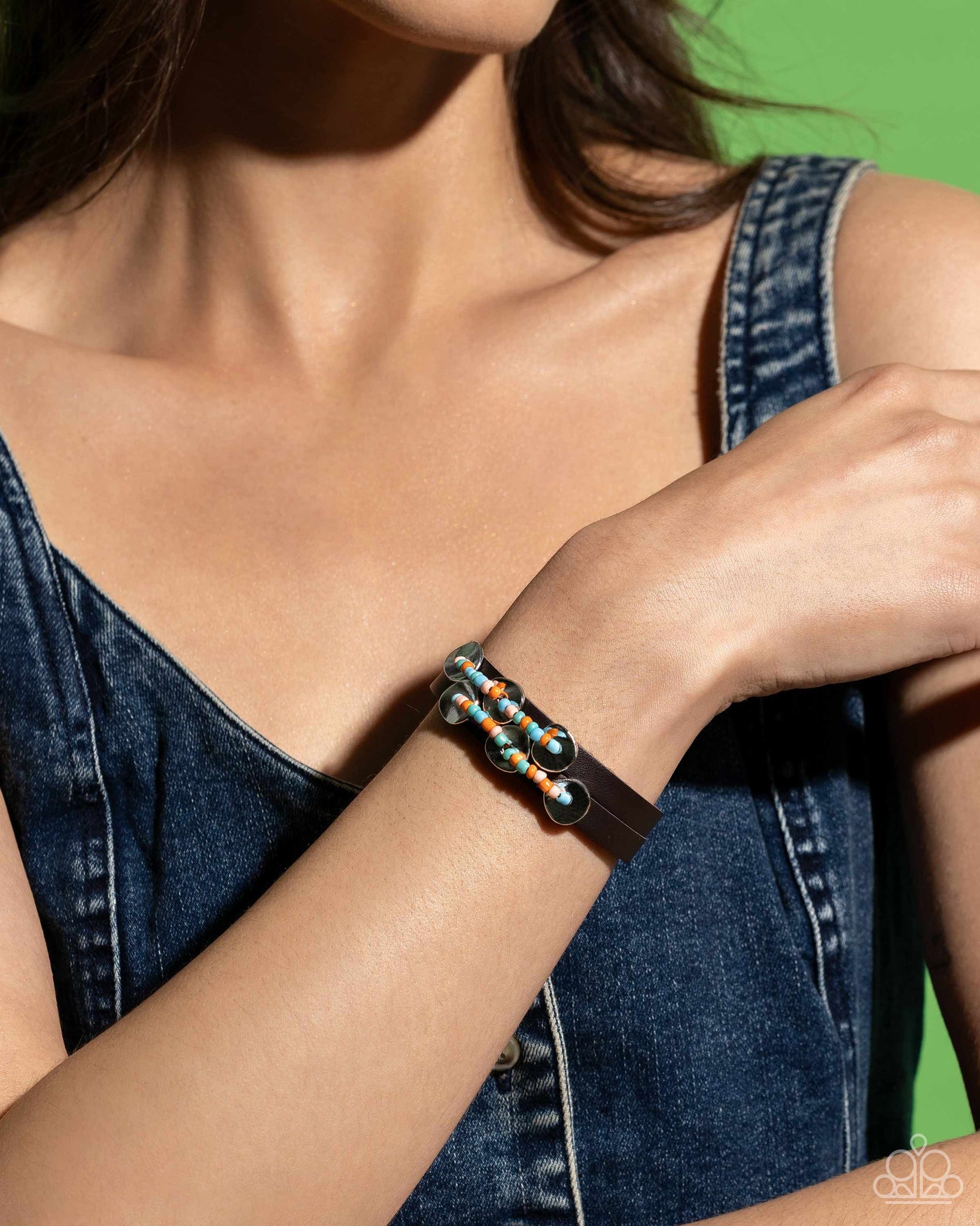 A strand of tiffany, light blue, orange, and baby pink seed beads weave through and across a trio of abnormal silver discs atop the front of a split skinny brown leather band, creating a colorfully urban display around the wrist. Features an adjustable snap closure.