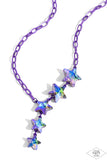 Textured electric purple hoops link together for a radiant finish across the neckline. Featuring a stellar UV shimmer, a collection of gem stars decrease in size as they cascade down the neckline in a diagonal pattern, creating an intense, incandescent statement piece. Features an adjustable clasp closure. Due to its prismatic palette, color may vary.