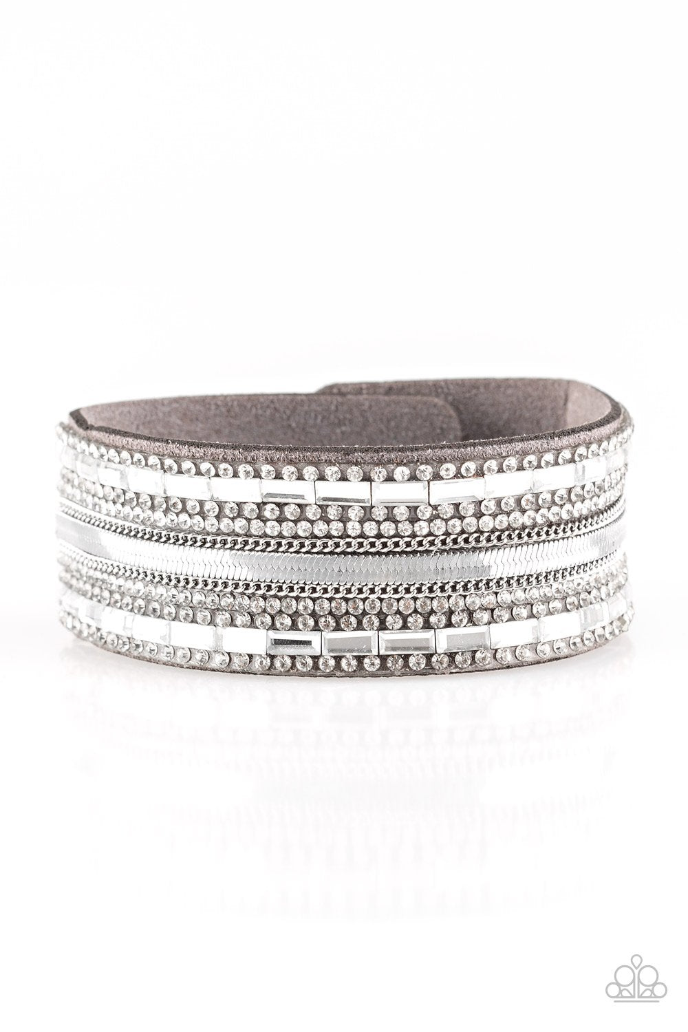 Mismatched silver chains, glassy emerald-cut, and glittery white rhinestones are encrusted along a thick gray suede band for a sassy look. Features an adjustable snap closure.
