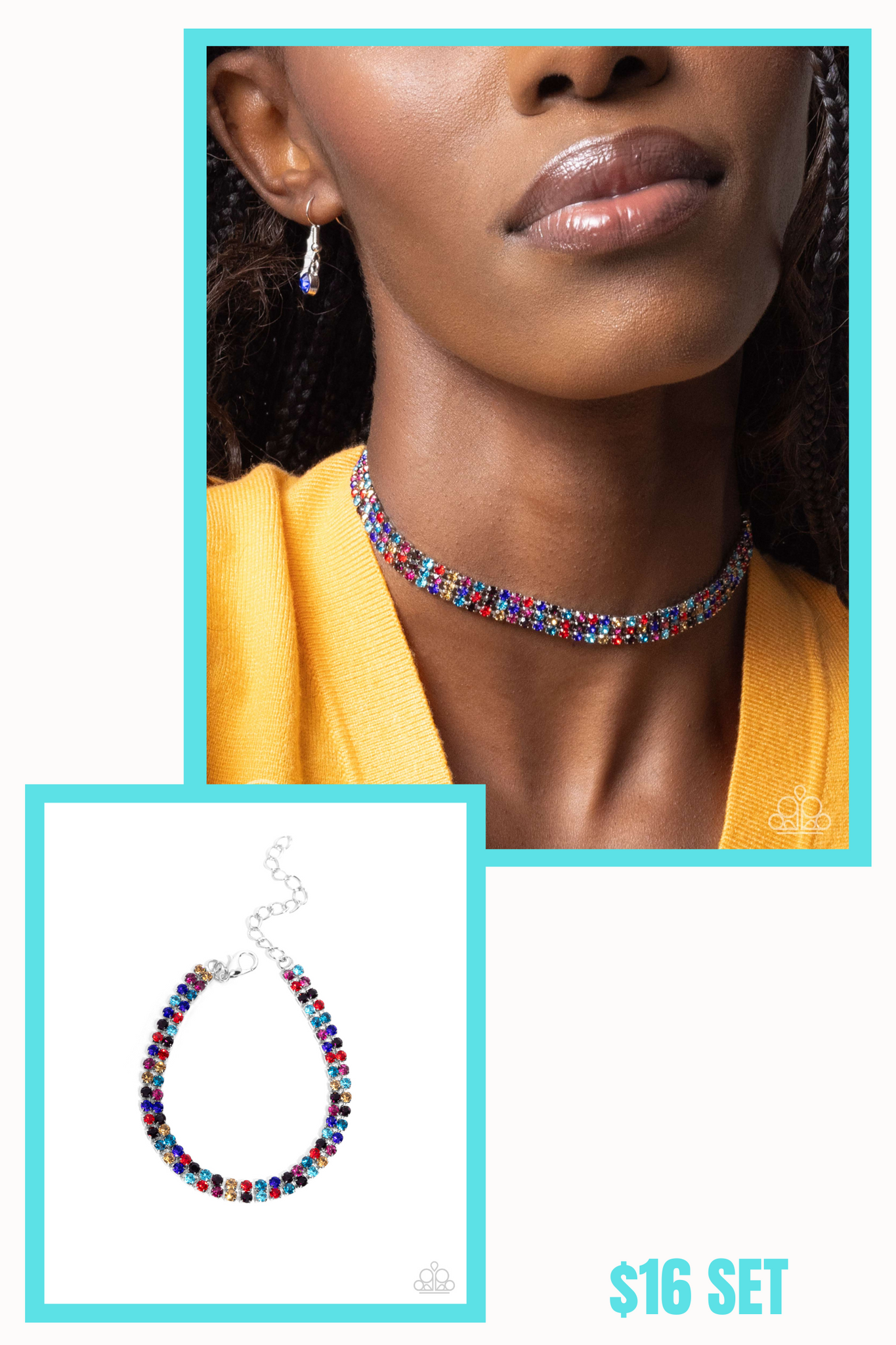 BRACELET: Thrilling Trio • Multicolor P9RE-MTXX-175EI: Featuring sleek square fittings, strands of glittery multicolored crystal-like and faceted rhinestones coalesce into a regal display around the wrist. Features an adjustable clasp closure.