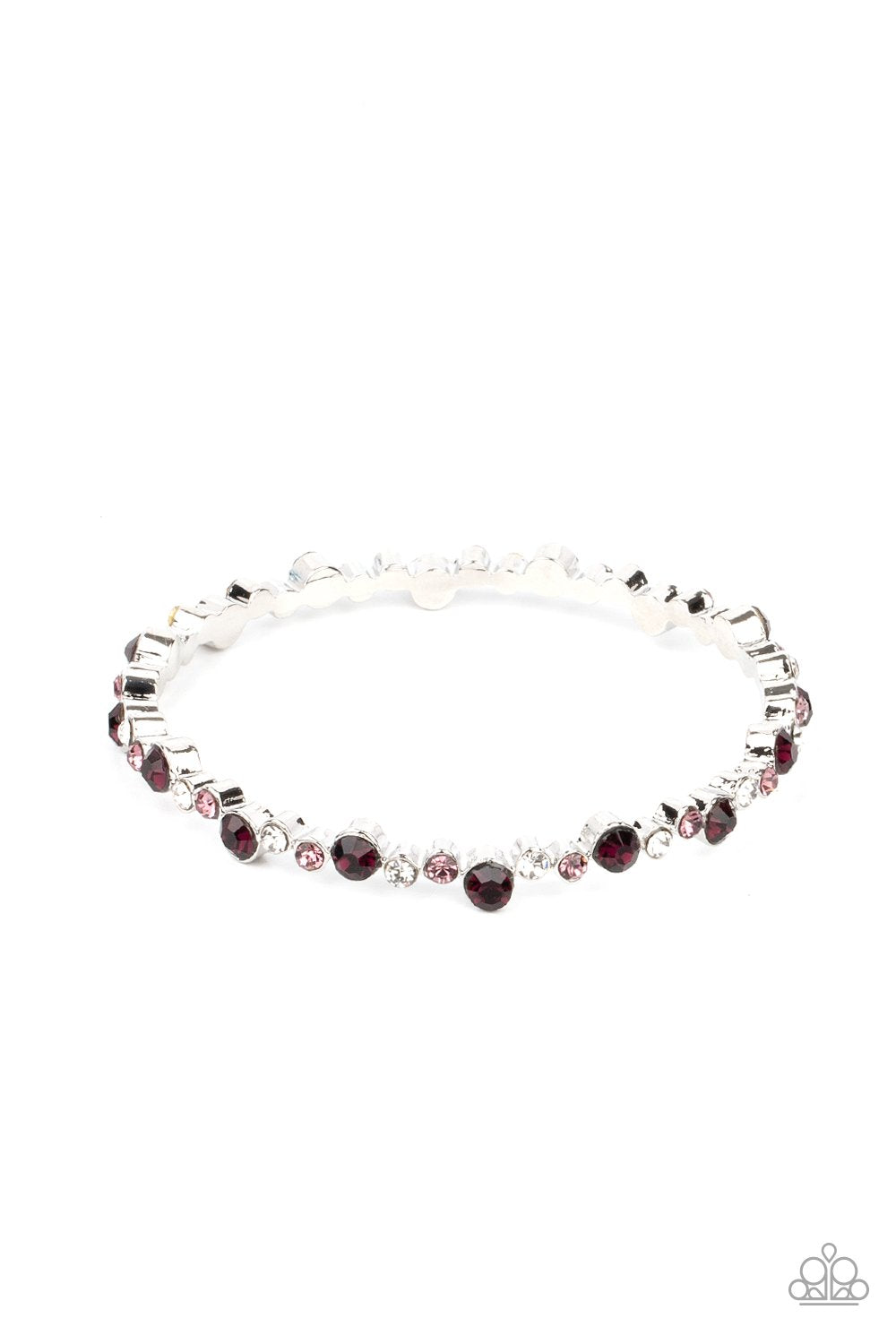 Encased in sleek silver fittings, a twinkly collection of dark purple, purple, and white rhinestones coalesce into a glittery bangle around the wrist.