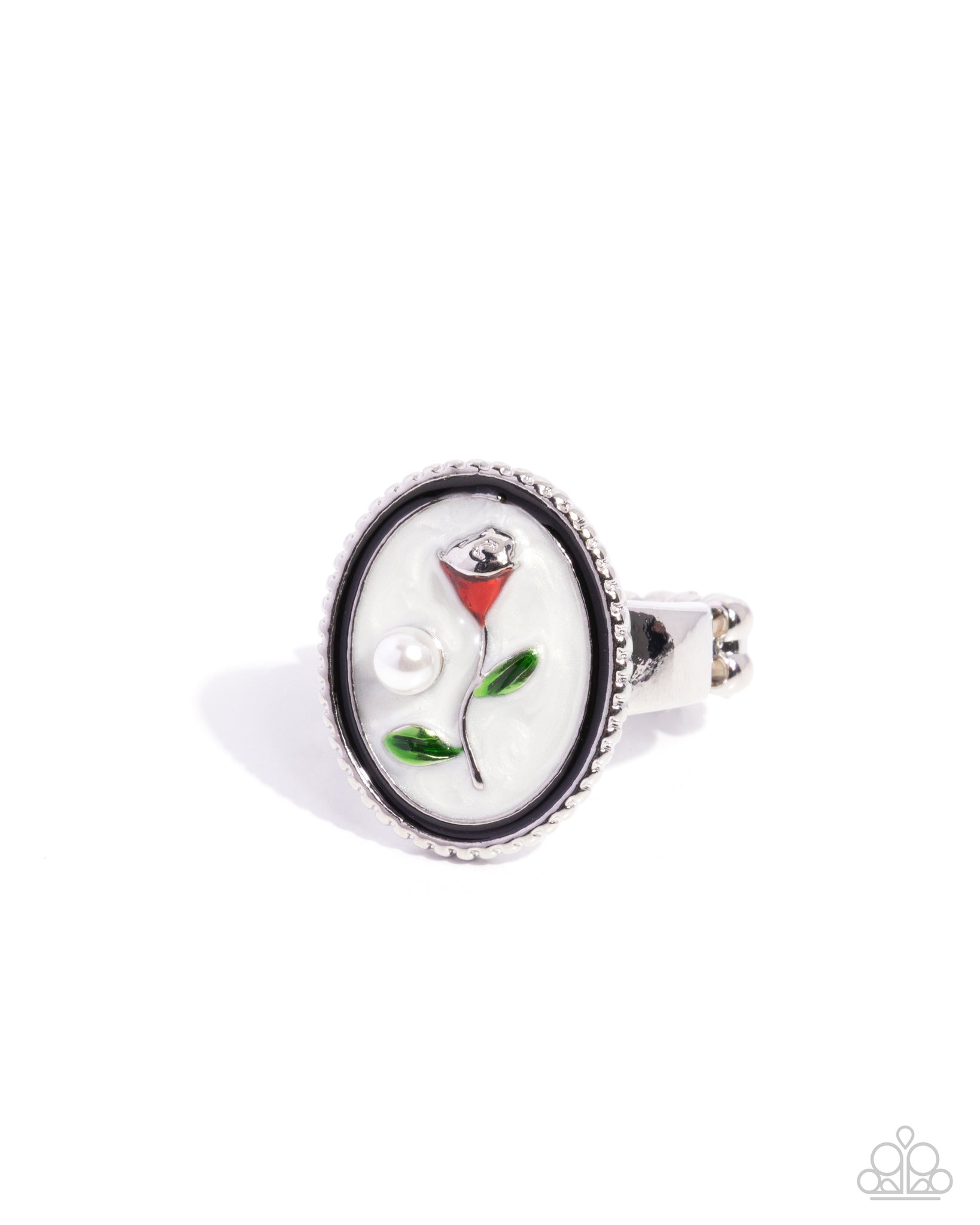 Modeled after a wax seal, a red-painted tulip with green-painted leaves stands out in the center of a swirly white pearl-painted backdrop, while a glossy white pearl adds a refined touch. The flower and pearl draw even more attention as the backdrop is surrounded by a crisp border of black paint and textured twisted silver for a whimsically Victorian centerpiece. Features a dainty stretchy band for a flexible fit.