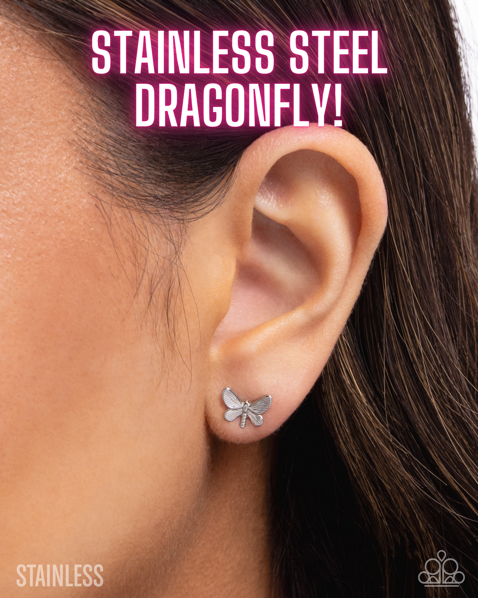 Featuring stainless steel, a textured silver dragonfly sits atop the ear for a classic, whimsical display. Earring attaches to a standard post fitting.
